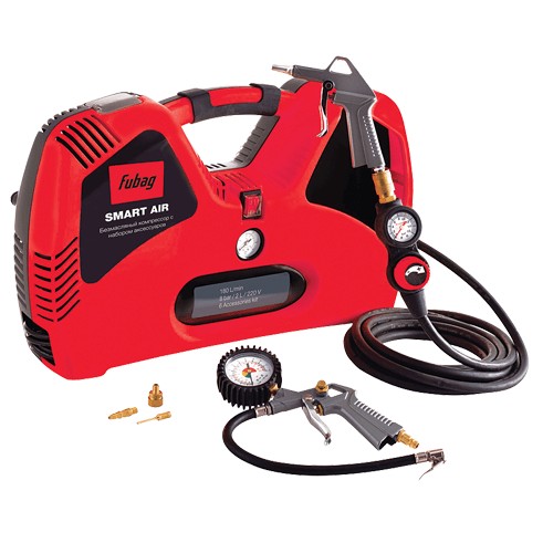 шланг резиновый 5м; продувочный пистолет; пистолет для накачки шин; насадки для накачки мяча, матраса, велосипедных колес