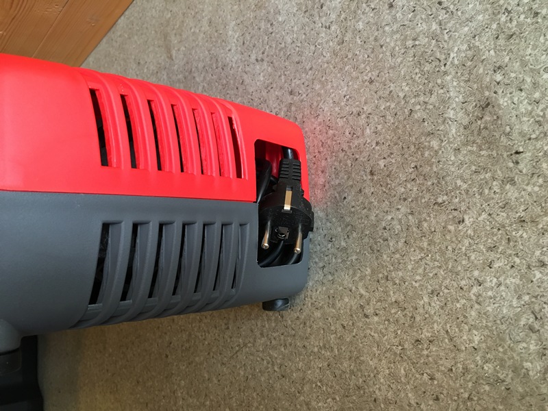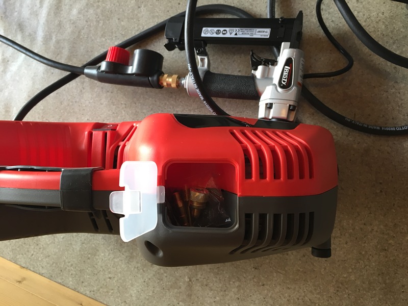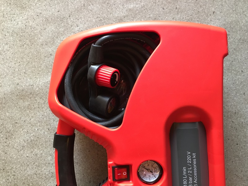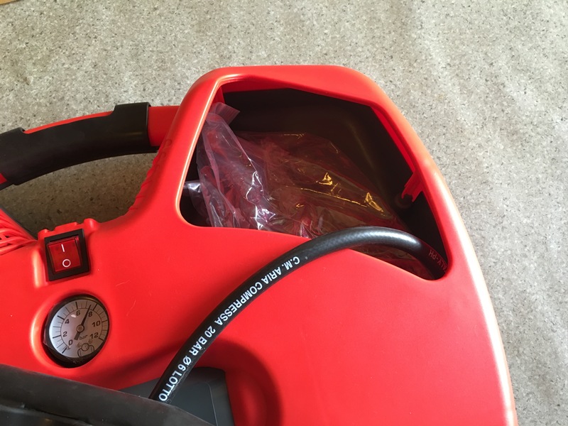 Компрессор выполнен в виде кейса с ресивером 2 литра и нишами для хранения шланга, электрического провода и продувочного пистолета.