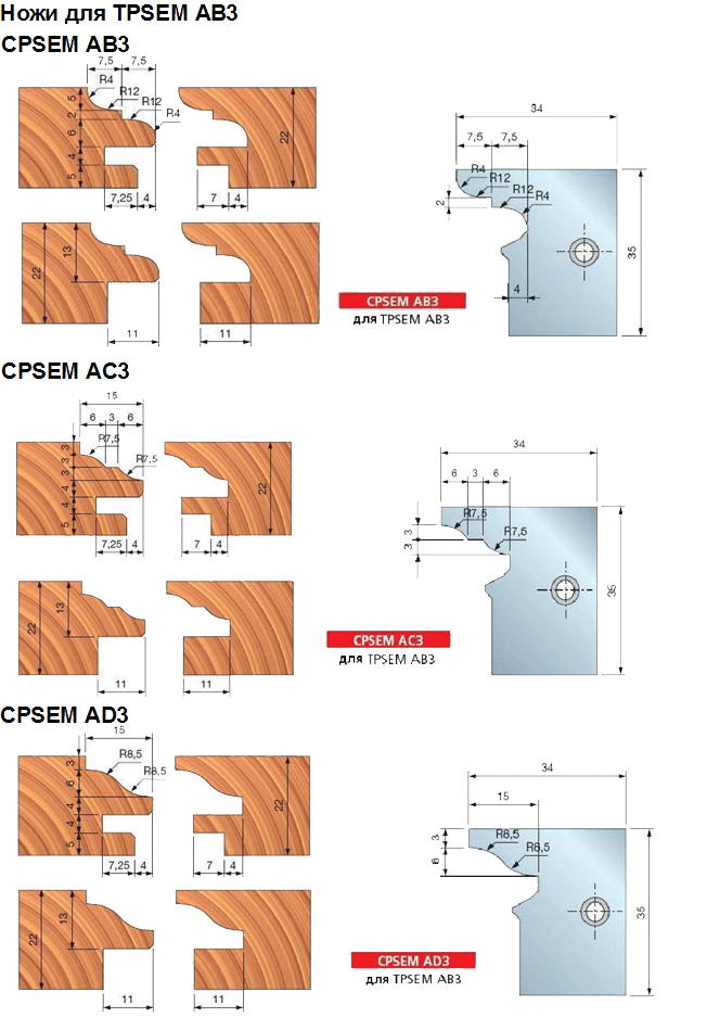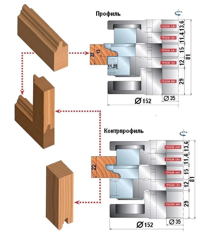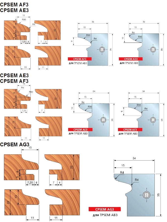 Предназначен для изготовления мебельных фасадов толщиной 22 мм. Комплект состоит из трех стальных фрезерных головок, оснащаемых твердосплавными ножами: профильные ножи в комплект не входят и заказываются отдельно (6 вариантов профиля). В комплект TPSEM22 GB3 входят фрезы TPSEMAB3, TPSEMCB3, TPSEMDB3 и два стальных диска FXSEMAB9 и FXSEMВB9, которые закрывают фрезы с торцов. Диски необходимо использовать на станках с ручной подачей заготовки. Используется на универсальных фрезерных станках с ручной подачей заготовок.