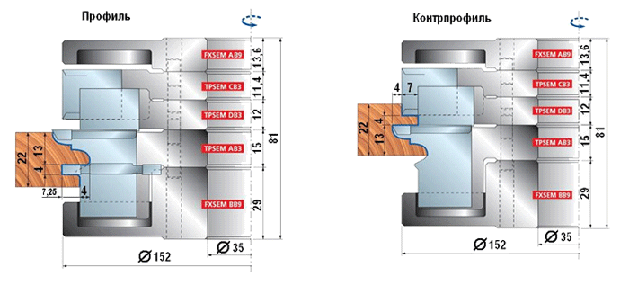 Для изготовления обвязки мебельного фасада толщиной 22 мм используются TPSEMAB3 + TPSEMDB3 + TPSEMCB3+ FXSEMAB9 + FXSEMВB9