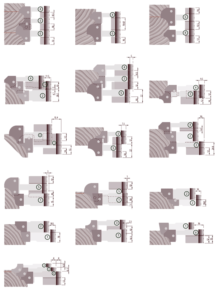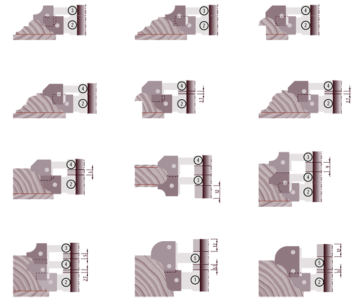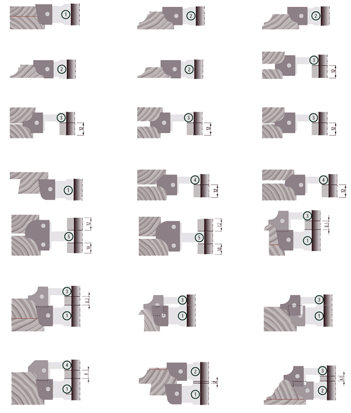 Комплект состоит из пяти насадных фрез. Применяется для изготовления различных профильных поверхностей в древесине твердых и мягких пород, плитных материалах с покрытием или без покрытия.