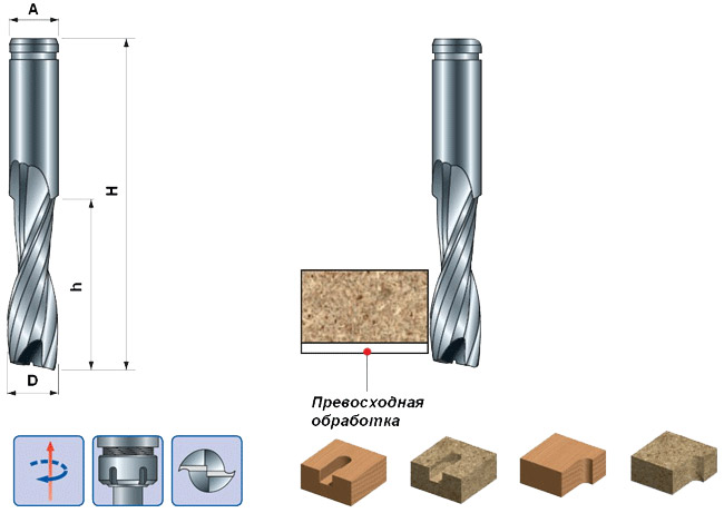 Предназначена для форматного фрезерования, фрезерования пазов и финишной обработки твердых пород древесины и ламината. Допускает обработку с большой скоростью подачи в заготовках, зафиксированных на рабочем столе станка. Фреза имеет заточку по спирали, что позволяет получить гладкое и чистое резание. Спираль направлена для выброса стружки вниз, соответственно обеспечивается превосходное качество обработки верхней пласти. Используется на автоматических обрабатывающих центрах и фрезерных станках CNC.