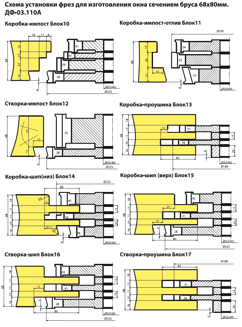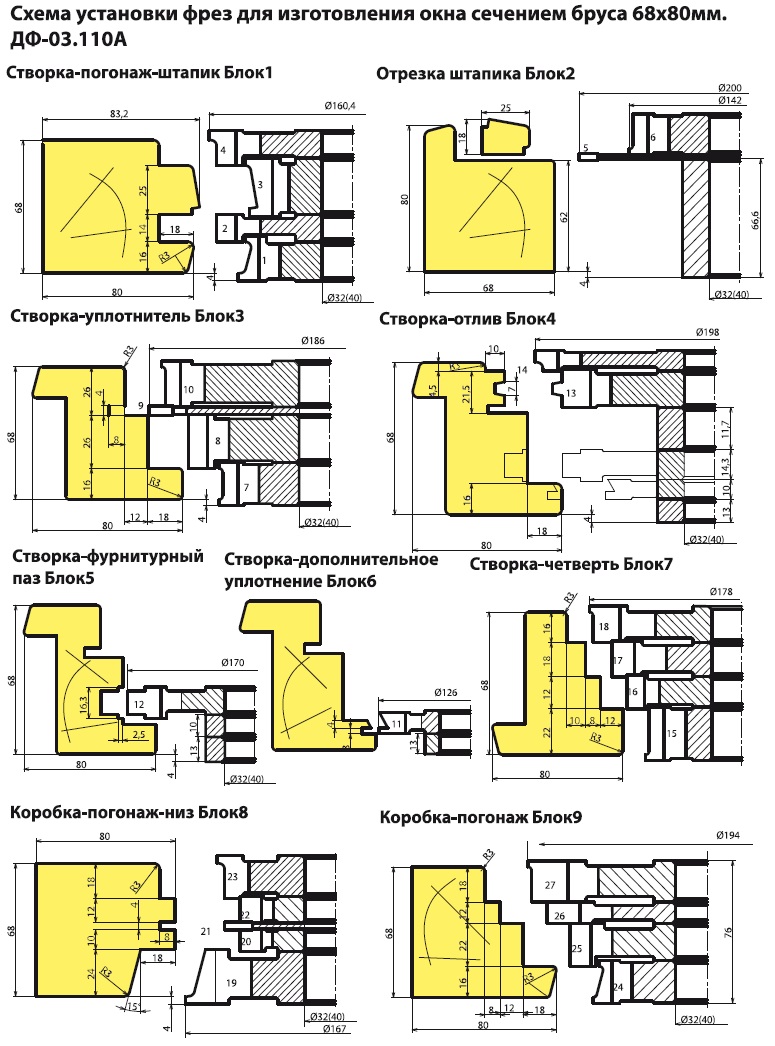 Возможна поставка комплекта фрез по варианту А, состоящего из 53 фрез с возможностью обработки как бруса 68х80 мм, так и бруса 78х80 мм. Также выборочная поставка фрез и блоков. При использовании предлагаемых схем обработки нет необходимости в межоперационной переналадке оборудования, так как фрезы спроектированы с учетом необходимости одной операционной базы.