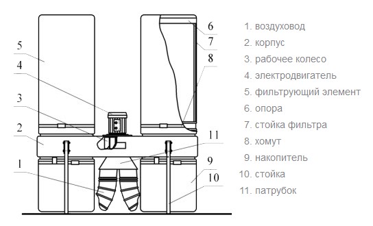 Установка состоит из корпуса со встроенным пылевым вентилятором. К корпусу с помощью легкосъемных хомутов крепятся мешки – накопители отходов и фильтры. Стружкоотсосы комплектуются гибкими воздуховодами длиной 2 м на каждый вход. В стандартном исполнении стружкоотсос оснащен двумя воздуховодами диаметром 160 мм. По заказу изготавливаются переходники на различное количество входных патрубков и различных диаметров.