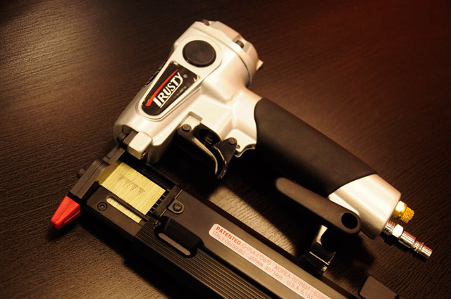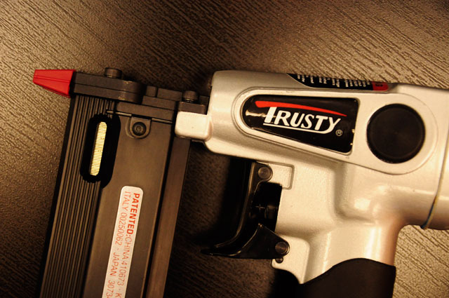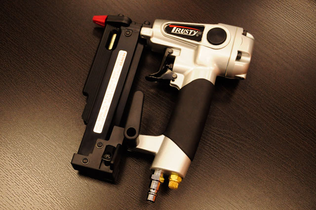 Пистолет оборудован поясным крюком, позволяющим зацепить его за пояс или карман и работать двумя руками. Основное применение - финишные работы, работа с мебелью, наличниками, плинтусами, высококлассные ремонтные работы. Имеет силиконовую насадкку на стволе для аккуратной работы с материалом и индикатор пустого магазина.