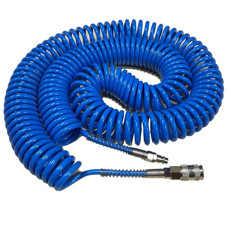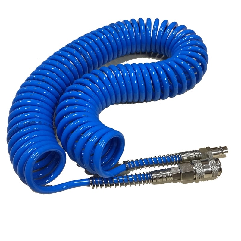 - Спиральные пневошланги — их главной особенностью является намотка, из-за которой этот вид и получил название. Она обеспечивает компактность и делает шланги оптимальным вариантом, когда нужно экономить пространство, его недостаточно или изделия приходится часто транспортировать.